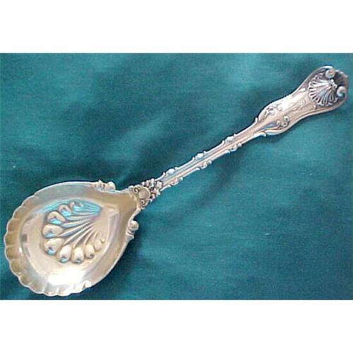 This is a gorgeous piece of American Victorian sterling silver! It is the large, 9" long, berry spoon in the magnificent Imperial Queen pattern by Whiting. The shell pattern is bold and crisp on both sides of the handle and is reflected in the fancy design of the bowl. This spoon is monogrammed F and is in excellent condition. Shipping to US addresses is $8.