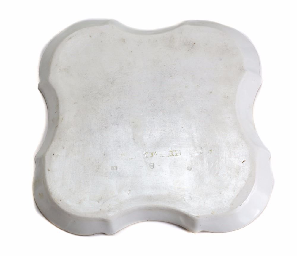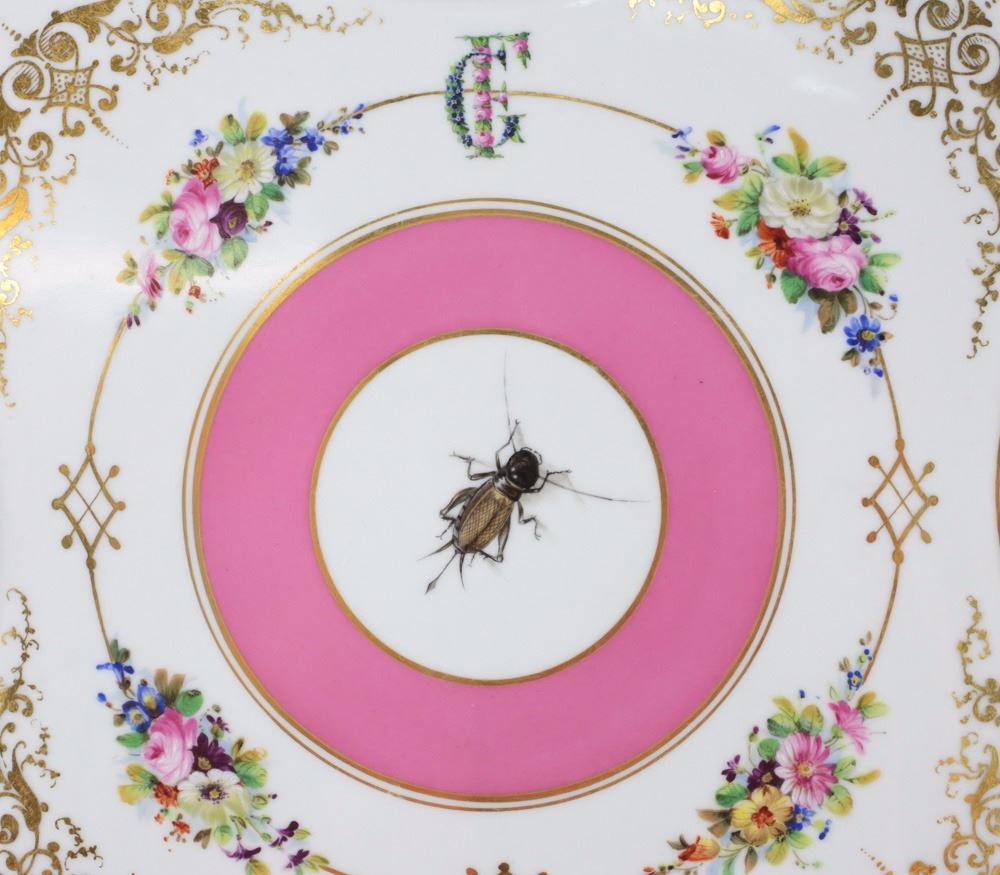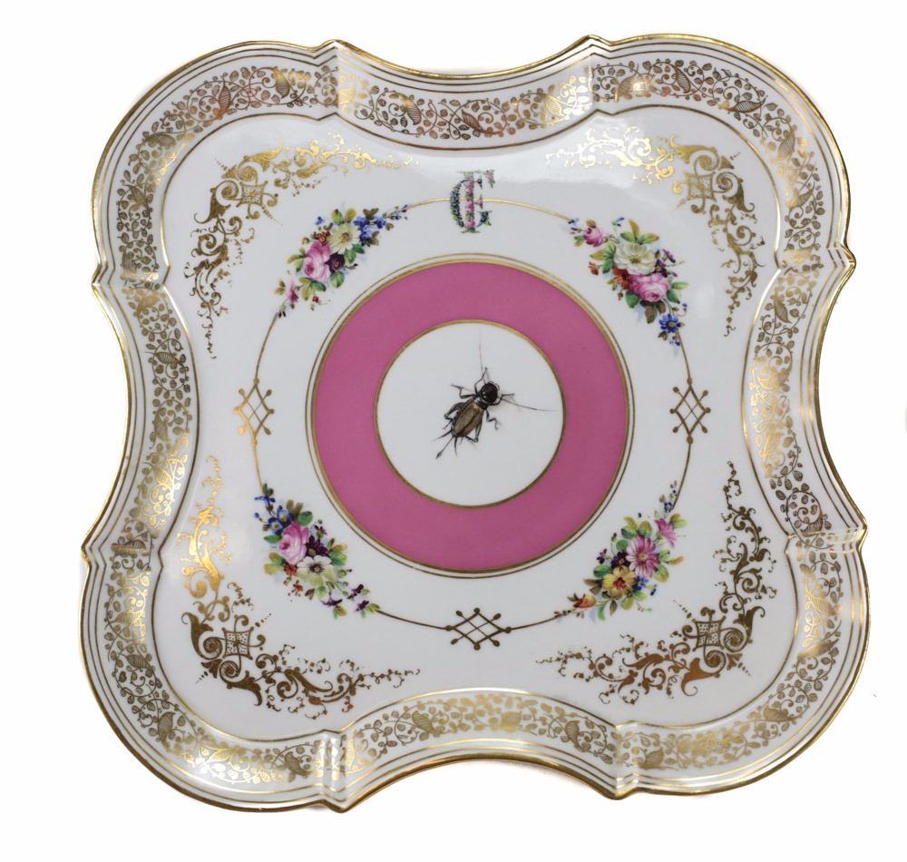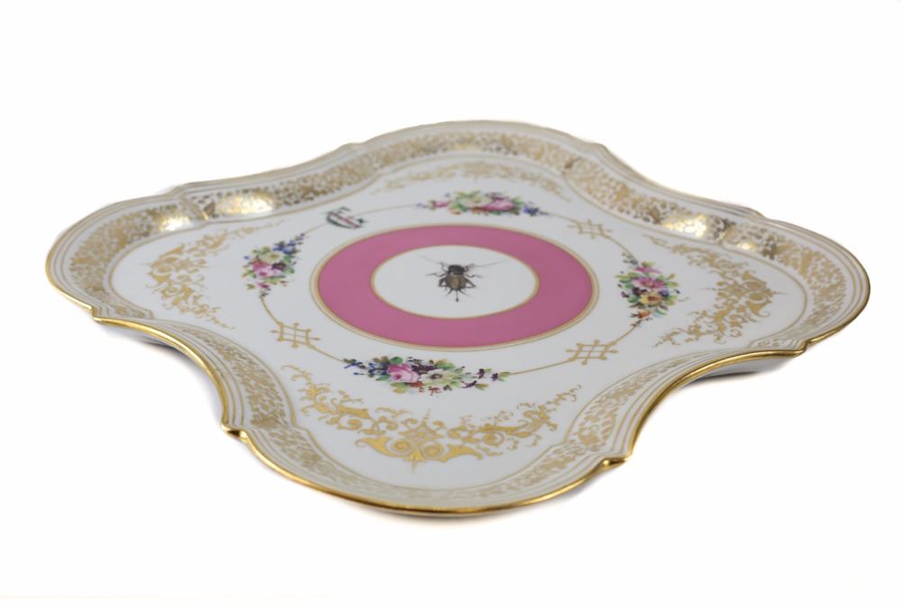 A finely painted porcelain square tray from the Imperial Porcelain Factory in Vienna. Hand patined with floral wreath bouquets, pink ground, and gilt scroll-work foliage along rim and handle with cricket motif to the center. Date mark for 1858, with incised bindenschild and shape number.