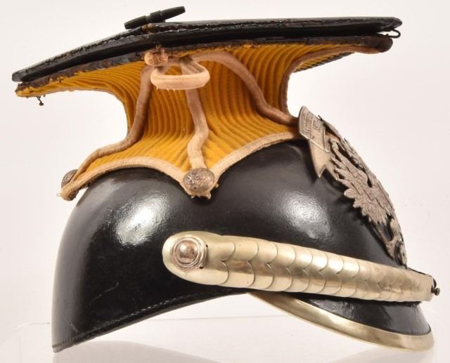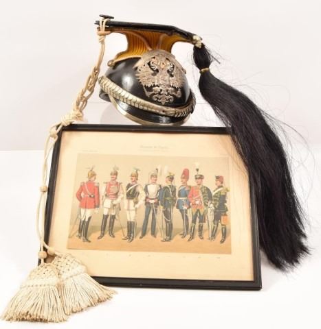 Helmet includes white cord and horsehair attachment. Lithograph of Prussian Cavalry uniforms, frame measures 14.75" x 11.75"