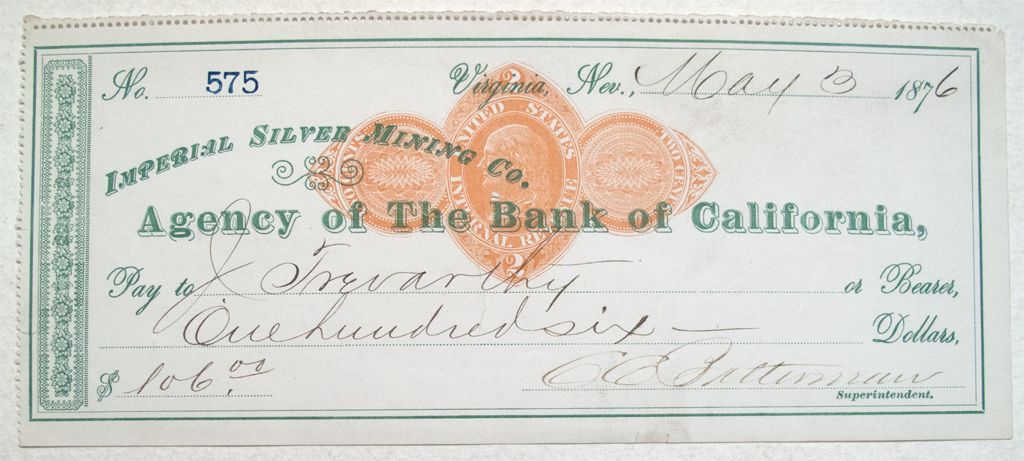 From the Agency of the Bank of California. The bank is common the mining company is rare! 1876 to J. Trewarthy.