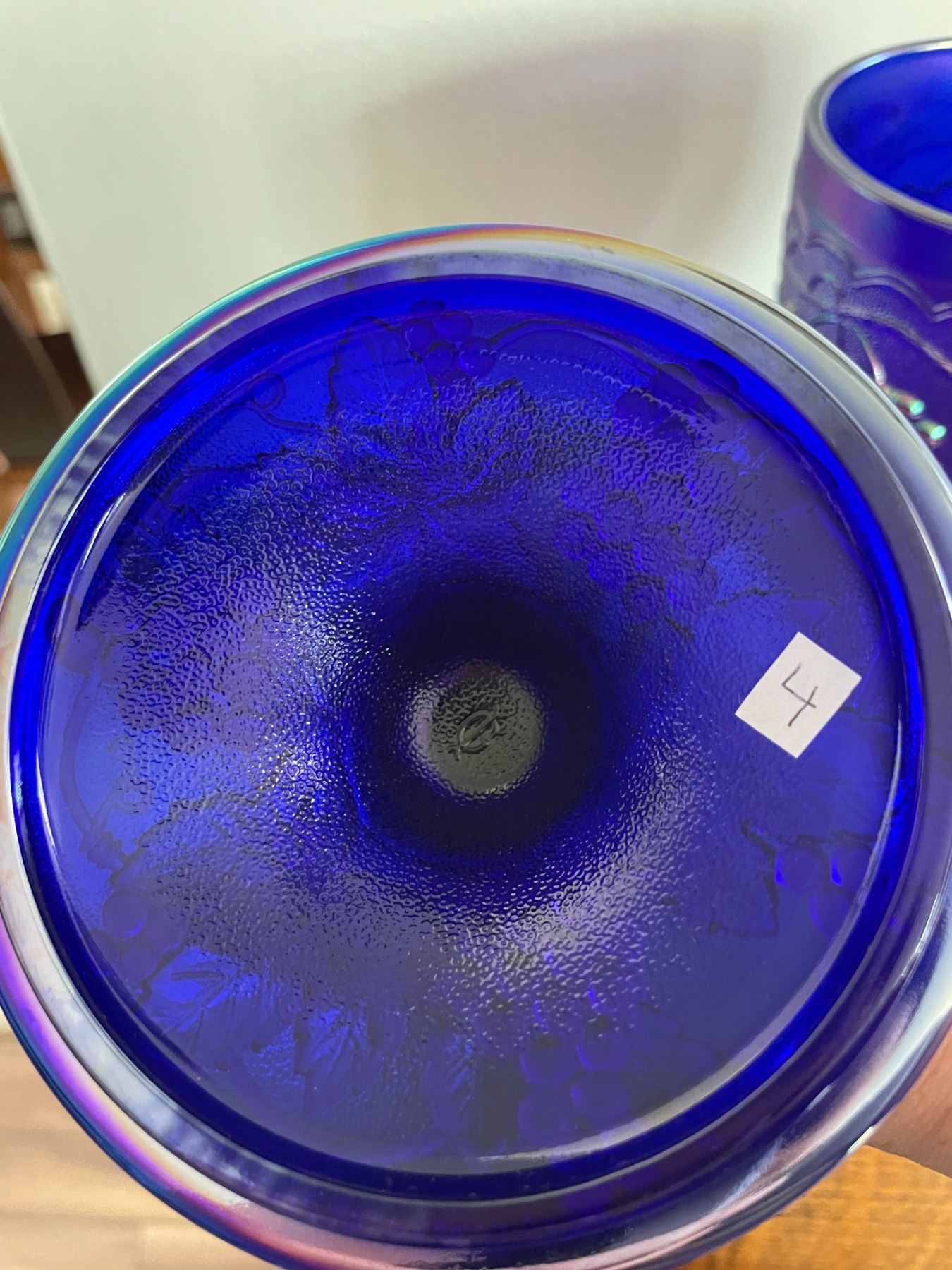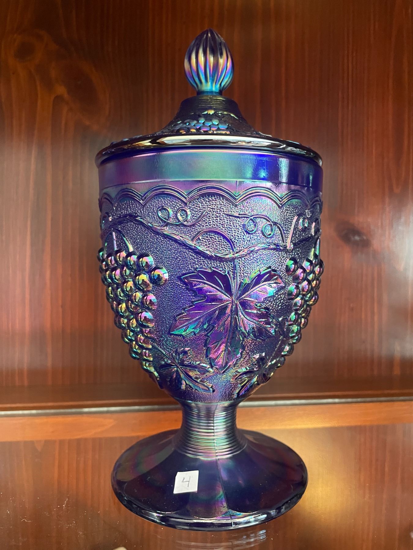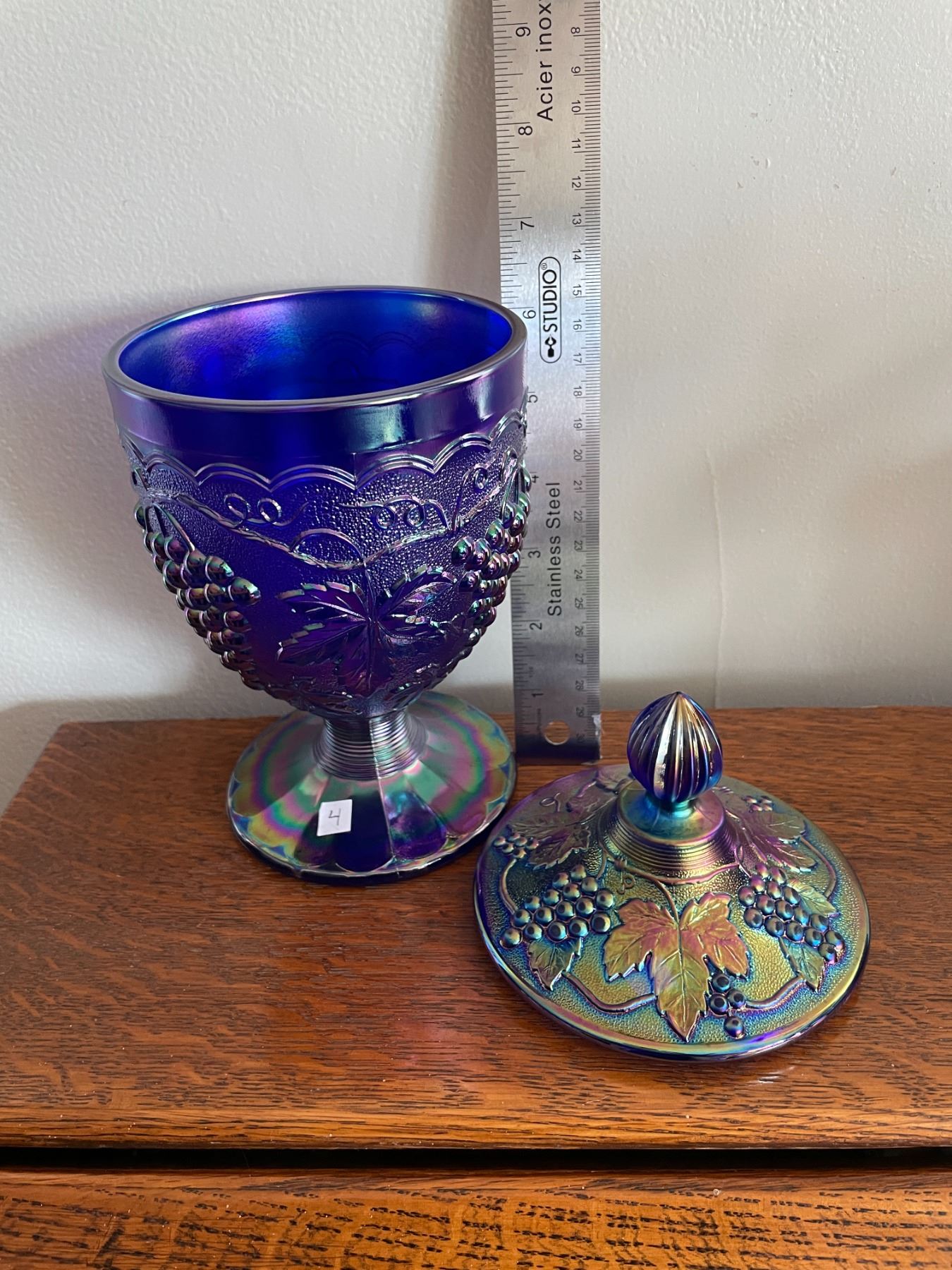 Imperial glass, blue, iridescent candy dish with lid, in harvest grape pattern