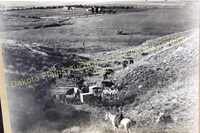 Imperial size cabinet card by F.M. Steeleof posed image with F.M.Steele wagon in forefront along side a young woman on side saddle and ranch in background. Unidentified thought be near Dodge City, 11" X 14". From the Gary Helin collection. Est. 300-600