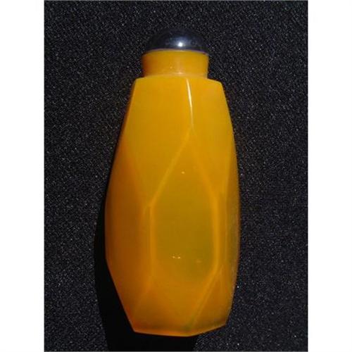 Imperial yelow Peking glass snuff bottle with a geometric design. A black color Peking glass stopper complements this exquisite pate du verre art glass snuff bottle. Length: 2.8" (7 cm.). Estimated retail value: $700.