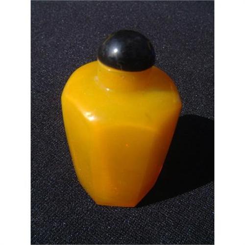 Imperial yellow Peking glass snuff bottle with a hexagonal design. A black color Peking glass stopper complements this exquisite pate du verre art glass snuff bottle. Length: 2.8" (7 cm.). Estimated retail value: $650.