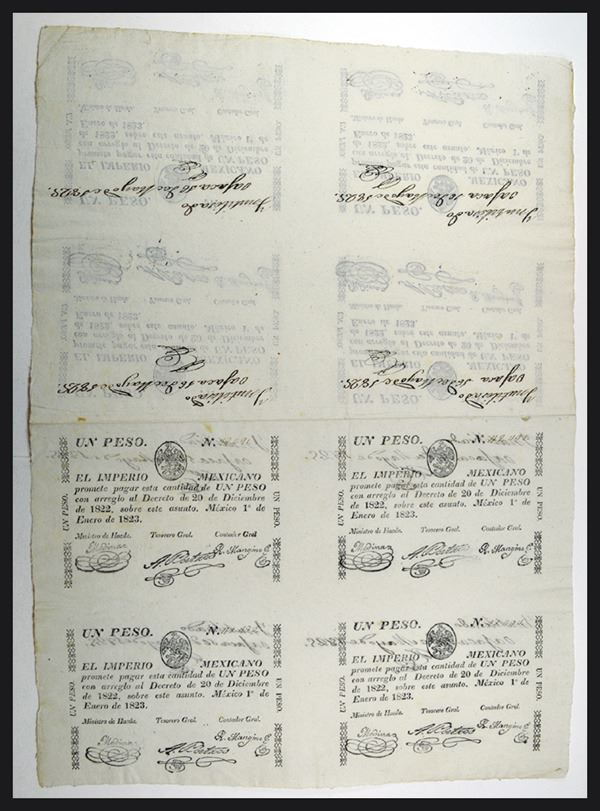 Mexico. 1 Peso, SCWPM 1c. Uncut sheet of 8 notes, all with 1826 notation. Folded in half in center long ago. From an interesting time in Mexican history. 1 Sheet of 8 notes.