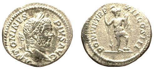 Caracalla. Denario. 198-217 d.C. Anv.: ANTONINVS PIVS AVG. Busto con laúrea a derecha. Rev.: PONTIF. TR. P. XII. COS. III. "La Virtud" con vestimenta militar y casco, sosteniendo lanza y parazonium. Ligeras oxidaciones superficiales. 3,14gr. SB-464. Ar. M