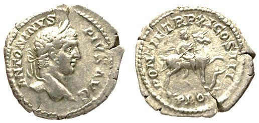 Caracalla. Denario. 198-217 d.C. Anv.: ANTONINVS PIVS AVG. Busto con laúrea a derecha. Rev.: PONTIF. TR. P. XI. COS. III. Caracalla sobre caballo a derecha con lanza y a sus pies. Leves grietas de acuñación. 3,19gr. SB-456a variante. Ar. MBC/MBC+.
