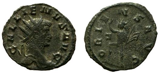 Galieno. Antoniniano. s/d. Anv.: GALLIENVS AVG. Busto radiado a derecha. Rev.: ORIENS AVG. "El Sol" radiado a izquierda con arco y flechas. Pequeños restos de plateado original. 2,67gr. CH-699. Ae. BC+.