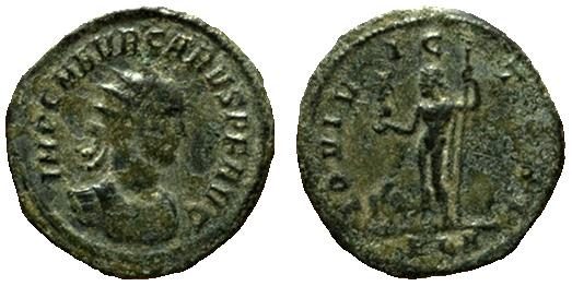 Caro. Antoniniano. 282-283 d. C. Anv.: IMP. C. M. AVR. CARVS P. F. AVG. Busto radiado y revestido a derecha. Rev.: IOVI VICTORI. Jupiter en pie a izquierda con cetro y Victoria, a sus pies un águila. 3,37gr. CH-37. Ae. MBC-.