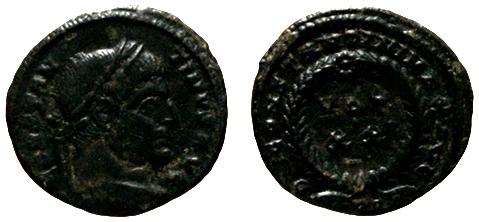 Constantino I, El Grande. Follis. 321 d.C. Anv.: CONSTANTINVS AVG. Busto con láurea a derecha. Rev.: DN CONSTANTINI MAX. AVG. Alrededor corona de laurel con la inscripción VOT. / XX. PA en exergo. 2,94gr. CH-126. Ae. MBC+.
