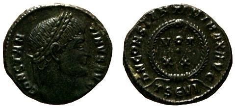 Constantino I, El Grande. Follis. 321 d.C. Anv.: CONSTANTINVS AVG. Busto con diadema a derecha. Rev.: DN. CONSTANTINI MAX. AVG. Alrededor corona de laurel con la inscripción VOT. / XX. TSEVI en exergo. 3,78gr. CH-124 variante. Ae. EBC.