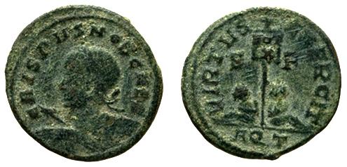 Crispo. 1/2 follis. s/d. Anv.: CRISPVS NOB. CAES. Busto con diadema a izquierda. Rev.: VIRTVS EXERCITVS. Estandarte y a sus pies dos cautivos. 3,3gr. CH-165. Ae. BC.