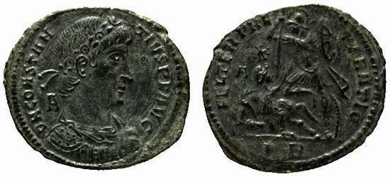 Constante. Maiorina. 348-350 d.C. Anv.: D. N. CONSTANS P. F. AVG. Busto con laúrea a derecha y con coraza, en el campo letra A. Rev.: FEL. TEMP. REPARATIO. Soldado atacando a jinete derribado, ambos con escudo. 5,13gr. CH-17. Ae. EBC-.