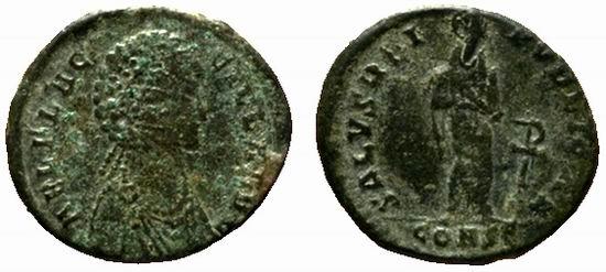 Aelia Flacila. Mariorina. 383-388 d. C. Anv.: AEL. FLACCILLA AVG. Busto con diadema y revestido a derecha. Rev.: SALVS REI PVBLICAE. Flacila, en pie con palma y en el campo un cristograma. Escasa. 5,59gr. CH-6. Ae. BC+.