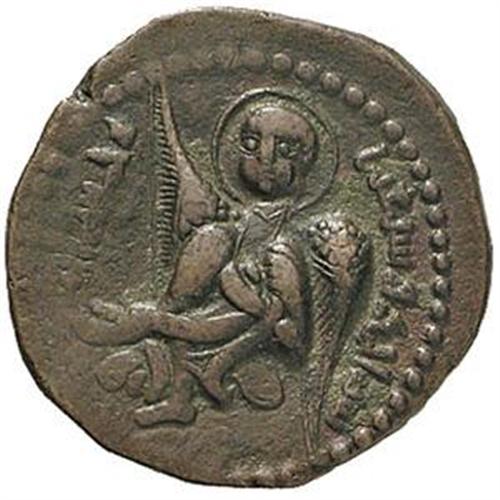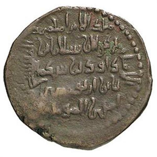 Oriente Antico. Impero Ottomano. Noureddin Mohammed (1174-1185). Dirham. D/ Un angelo, stante di fronte, con un nastro arrotolato sul polso sinistro e fissato sulla spalla destra. R/ Legenda centrale. Edhem 7. RR. AE. Molto raro. Patina cuoio. Bel BB.