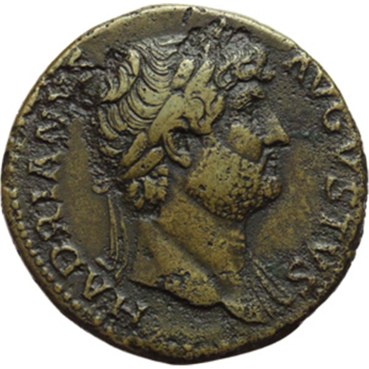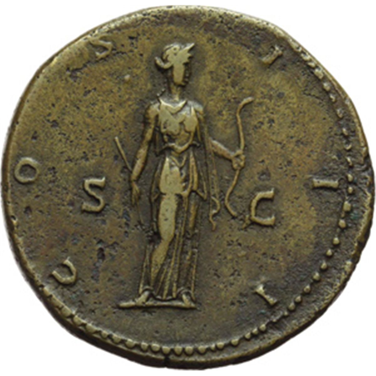 Impero Romano. Adriano (117-138). Sesterzio. D/ HADRIANVS AVGVSTVS. Busto laureato a destra con drappeggio sulla spalla sinistra. R/ COS III SC. Diana stante a destra tiene arco e freccia. RIC 631. OR. g. 25.18 mm. 33.00 Un esemplare molto attraente, con bella patina bronzo. BB.