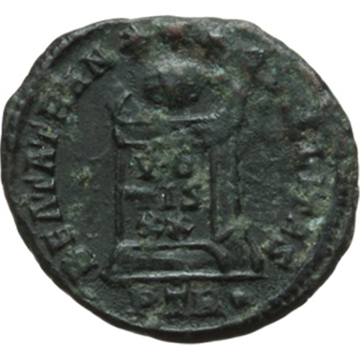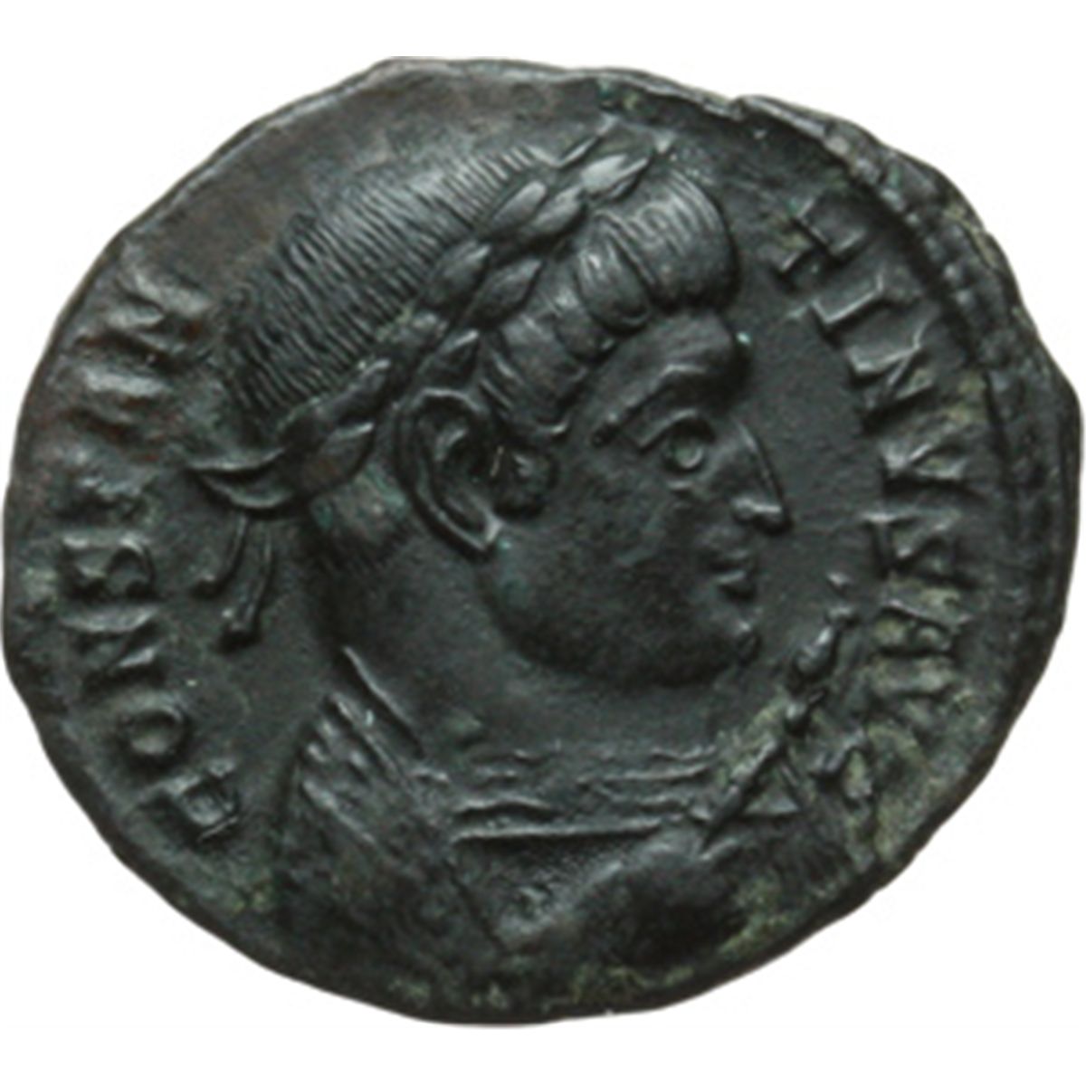 Impero Romano. Costantino I (307-337). Follis, Treveri. D/ CONSTANTINVS AVG. Busto laureato e paludato a destra tiene scettro con la mano destra. R/ BEATA TRANQVILLITAS. Globo su altare con iscrizione VO / TIS / XX. Sopra, tre stelle. In esergo: PTR·. RIC 342. AE. g. 2.73 Bel BB+/BB.