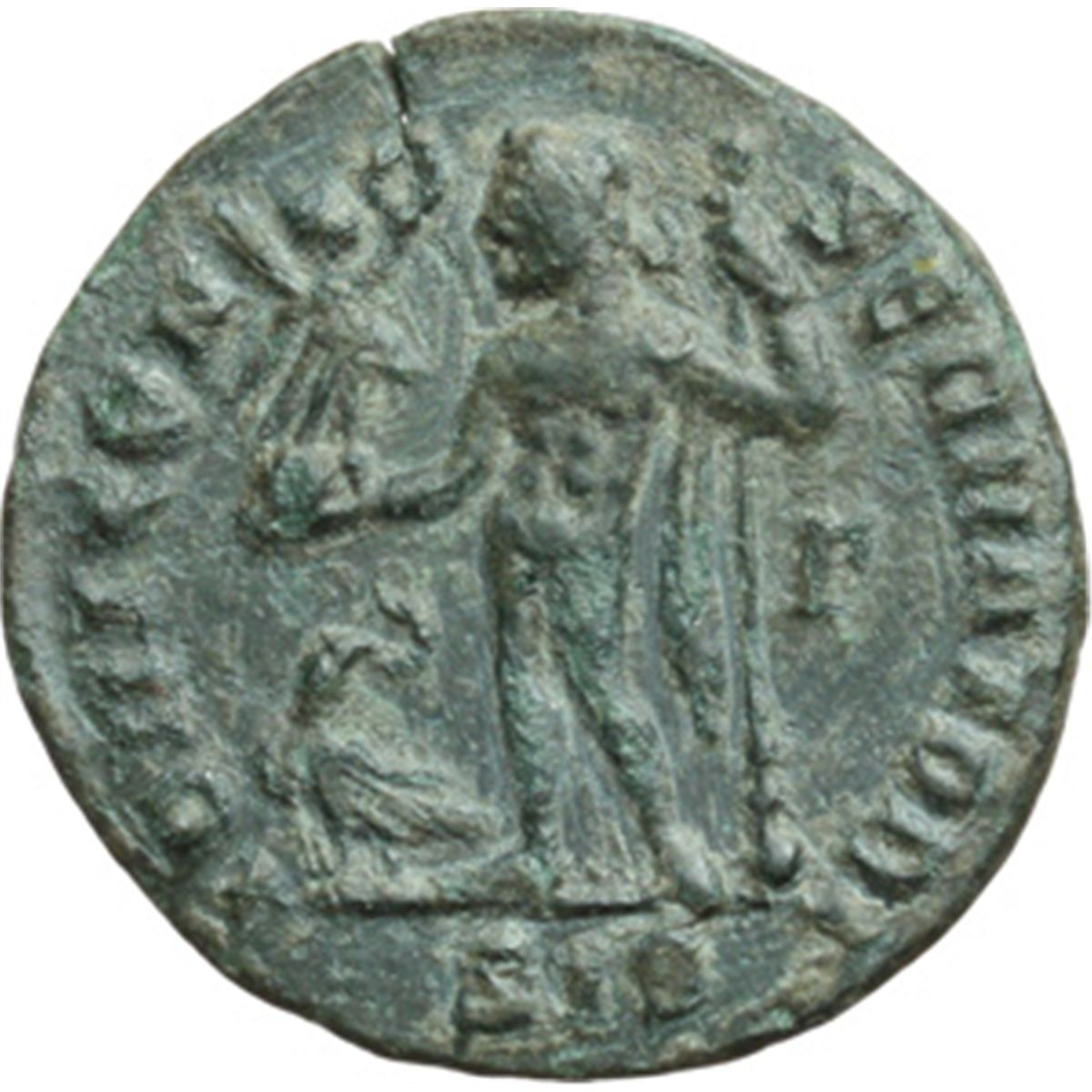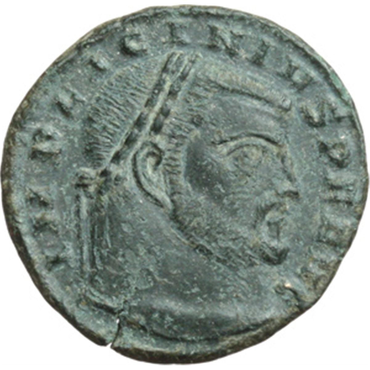 Impero Romano. Licinio I (308-324). Follis, Siscia. D/ Testa laureata a destra. R/ IOVI CONSERVATORI. Jupiter, stante a sinistra con scettro, tiene Vittoria su globo, che lo incorona. Ai suoi piedi, aquila con corona nel becco. Nel campo a destra, Γ•. In esergo: SIS. RIC 11 (R3). AE. g. 3.56 RRR. Bel BB+.