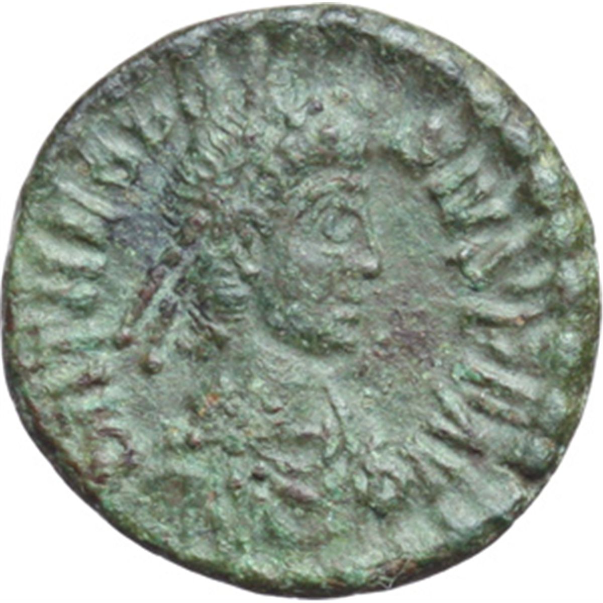 Impero Romano. Teodosio I (379-395). AE 13 mm. Siscia. D/ DN THEODOSIVS PF AVG. Busto diademato, drappeggiato e corazzato a destra. R/ VICTORIA AVGGG. Vittoria avanza a sinistra con corona e ramo di palma. In esergo: ASIS. RIC 39 (b). AE. g. 1.28 NC. qSPL. Di qualitv† eccellente. Bella patina verde.