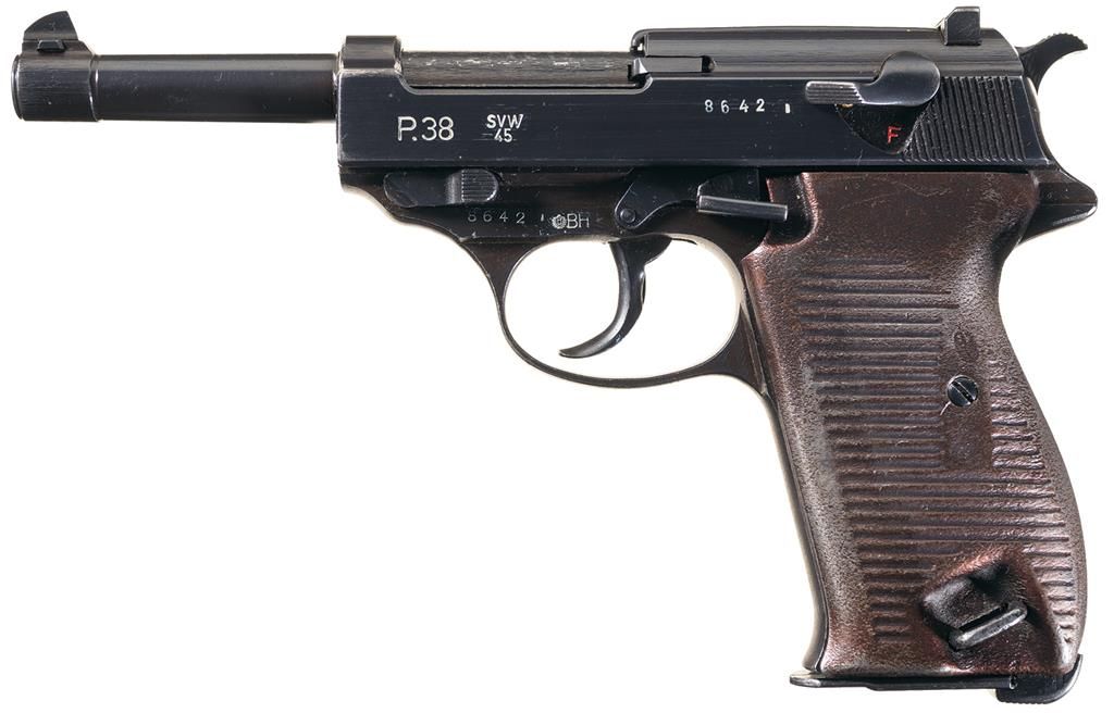 Produced after the Mauser factory was occupied by the French, this particular Mauser also bears the markings of the West German Federal Army, suggesting that it was handed over to the Germans by the French when the decision was made to re-arm the nation out of concern for a future European land war between NATO and the Warsaw Pact. Blade front and notch rear sights, with "P.38" and "svw/45" on the left side of the slide, matching numbers on the slide, frame, barrel and locking block, a French 5-pointed star in place of the old Nazi Eagle proofs, and an "(eagle)BH" Federal Army stamp on the left side of the frame. Fitted with a pair of stamped metal grips and a commercial Walther magazine.