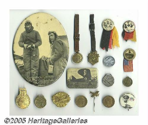 <B>Important Collection of Aviation Pins</B></I> Comprised of pins and a nice grouping of watch fobs, this interesting collection includes many early aviators both American and foreign. Pins picturing Douglas Corrigan, Stultz, Howard Hughes, Earhart and the fathers of aviation, Wilbur and Orville Wright, to mention only a few that are included. Most of the pins are celluloid and approximately 1 1/4" in diameter. A large size celluloid oval pictures two aviators, Smith and Ulm, commemorating a Trans-Pacific Flight in 1928. All, except the large oval, are in excellent to near mint condition with many designed graphically to include their planes and or gear. Metal aviation fobs are also included, along with tokens, one of which was a celebration for the Wright Brothers in Dayton, Ohio. Many with bold color and great graphics. Some we have never seen listed before. Such variety in aviation pins in one single collection would be hard to duplicate. Lot:253
