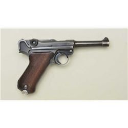 German Luger semi-auto pistol, bfy marked and 41 dated, 9mm cal., 4” barrel, military blue finish, checkered wood grips, #6566 y. This gun is in ov