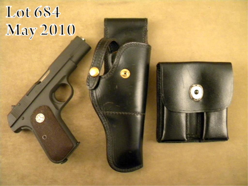 Important Colt Model 1903 General Officers U.S. Property-marked semi-auto pistol, previously belonging to Brigadier General Thomas W. Mellen, .32 cal., 4” barrel, parkerized finish, checkered Colt medallion wood grips, #570976. This gun is in overall fine condition showing approx. 99% original parkerized finish, fine bore, crisp action, fine markings, excellent wood grips with some small areas of compression to the checkering; accompanied with military black leather holster,double magazine black leather holder with an extra magazine, all in fine condition; cleaning rod and brass bristle bore brush and military or factory shipping pouch numbered to this gun with markings “MIL-B-131C CLASS 1 & 2, Dec. 1962 Lot 8 (alsoFeb. 1963 Lot 9)” and “AUTO PISTOL COLT CAL 32, 1 EA A 5-066, RK CB”. Most importantly, this lot is accompanied with the original Department of the Army Certificate of ownership presented to General Mellen on 18 April, 1969 and is numberedto this Colt. Thomas W. Mellen served in WW II as a Captain, G Company, 2nd Battalion, 97th Infantry Division under Brigadier General M.B. Halsey, fighting in Germany, occupying 2,000 square miles around the industrial centers in the