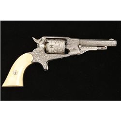 Colt Model 1860 Army percussion revolver, factory engraved, .44 cal., 8” barrel, nickel finish, silver plated brass trigger guard, ivory grips, #14