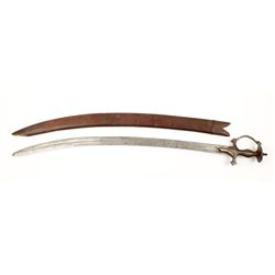 18th to 19th century Indian tulwar sword measuring 36” overall of 31” blade retaining scabbard but missing tip. The blade is plain and shows good