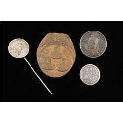 Lot of 4 misc. collectibles including an 1887 Victoria coin made into a pin; an 1854 seated liberty U.S. coin made into a tie tack; a copper “Old G