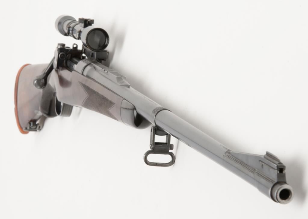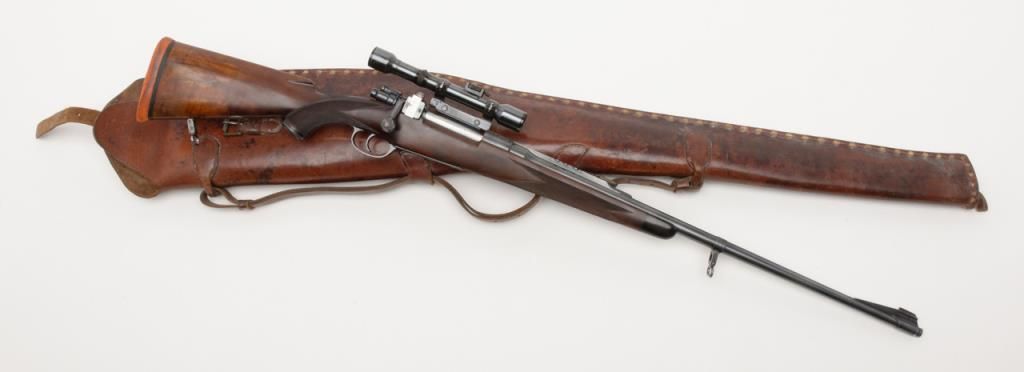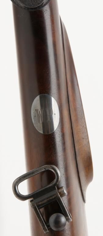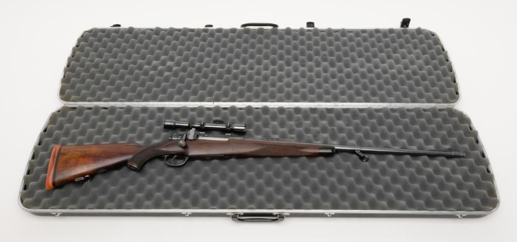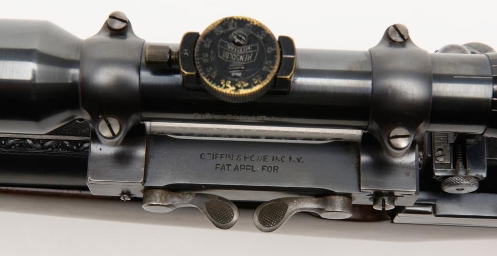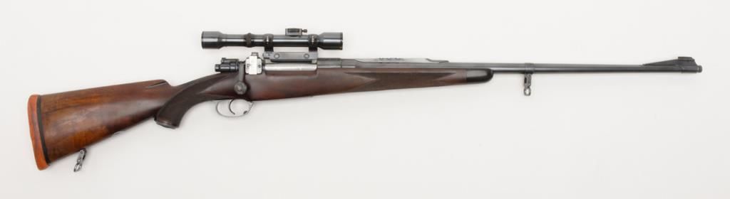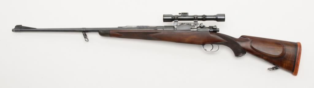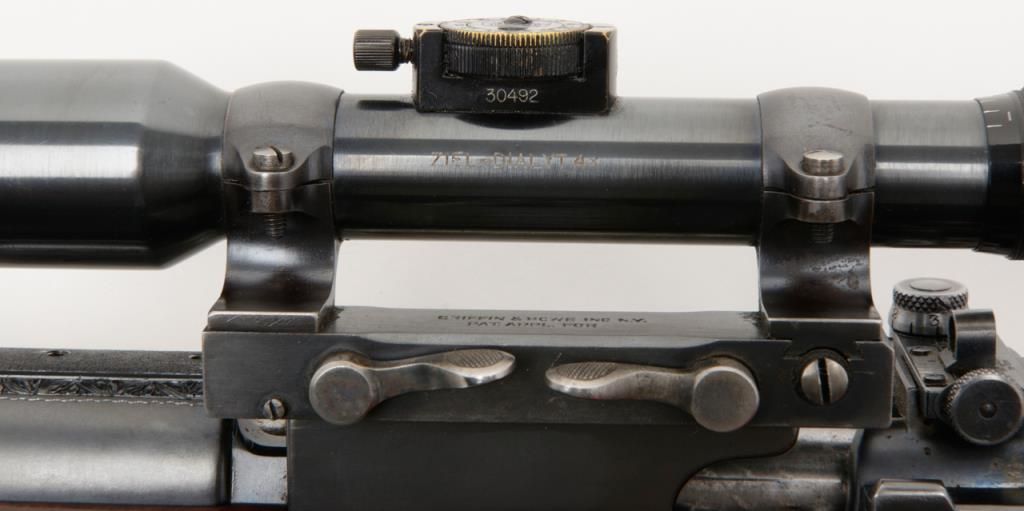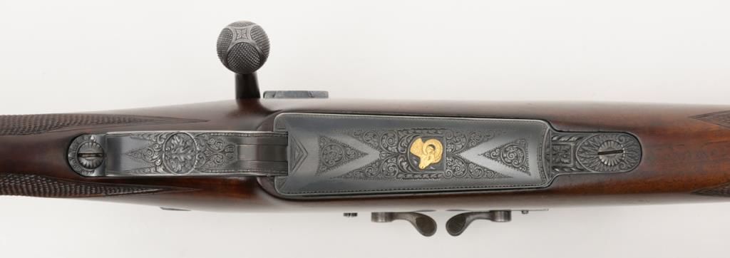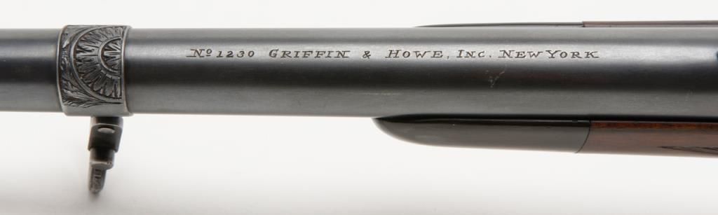 Important Griffin & Howe rifle with a Mauser action in .300 H & H caliber, 26-1/2” barrel, Lyman receiver mounted adjustable sight, G&H quick release sidemount with Ziel-Dialyt 4X scope #30492 displaying crystal clear optics; ¼ rib with 3 folding leaves, ramp front sight with beaded blade, engraved 4 panel bolt knob, engraved by Kornbrath with an inlaid gold ram’s head on the floor plate, silver oval on underside of butt stock with initials “WP” for famed aviator, WileyPost. The gun is in overall excellent condition showing the majority of its original blue finish with fine bore, crisp action, sharp markings including No. 1230 on top of barrel; quick release sling swivels; extensive detailed engraving onfloor plate, trigger guard, pistol grip cap, front sling swivel band, front sight band and associated muzzle area and top of receiver by the master engraver, Rudolph Kornbrath. The checkered wood stock is in fine condition with contrastingdark forend cap; red hard rubber butt pad is worn and somewhat compressed. The gun has been reviewed by Griffin and Howe with their finding of “excellent condition” cited in a letter dated August 24, 2005, signed by Joe Prather, President,