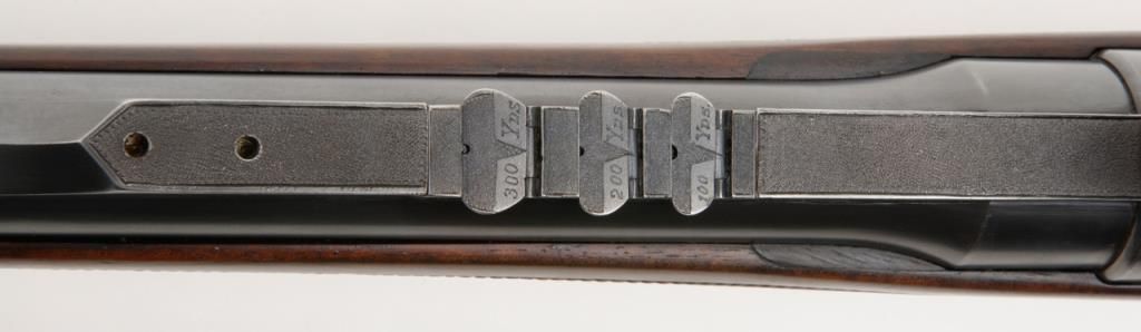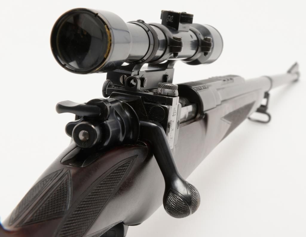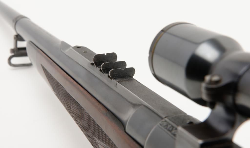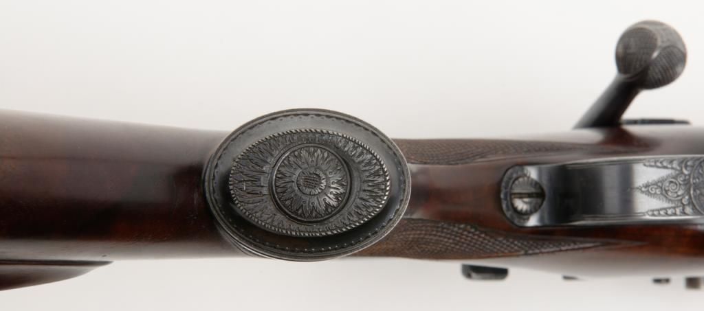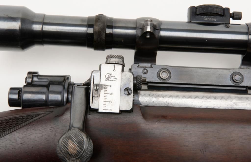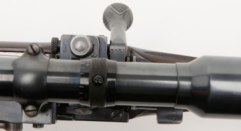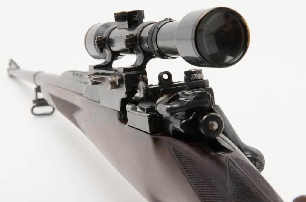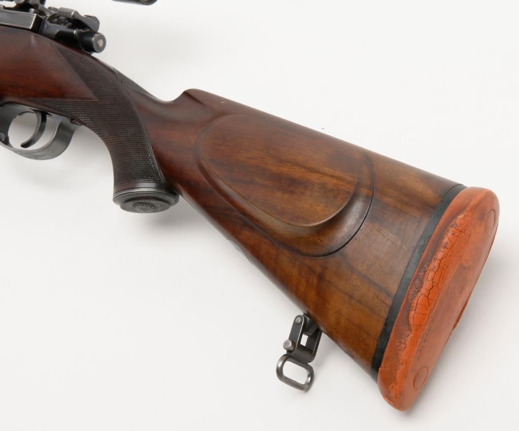 Important Griffin & Howe rifle with a Mauser action in .300 H & H caliber, 26-1/2” barrel, Lyman receiver mounted adjustable sight, G&H quick release sidemount with Ziel-Dialyt 4X scope #30492 displaying crystal clear optics; ¼ rib with 3 folding leaves, ramp front sight with beaded blade, engraved 4 panel bolt knob, engraved by Kornbrath with an inlaid gold ram’s head on the floor plate, silver oval on underside of butt stock with initials “WP” for famed aviator, WileyPost. The gun is in overall excellent condition showing the majority of its original blue finish with fine bore, crisp action, sharp markings including No. 1230 on top of barrel; quick release sling swivels; extensive detailed engraving onfloor plate, trigger guard, pistol grip cap, front sling swivel band, front sight band and associated muzzle area and top of receiver by the master engraver, Rudolph Kornbrath. The checkered wood stock is in fine condition with contrastingdark forend cap; red hard rubber butt pad is worn and somewhat compressed. The gun has been reviewed by Griffin and Howe with their finding of “excellent condition” cited in a letter dated August 24, 2005, signed by Joe Prather, President,