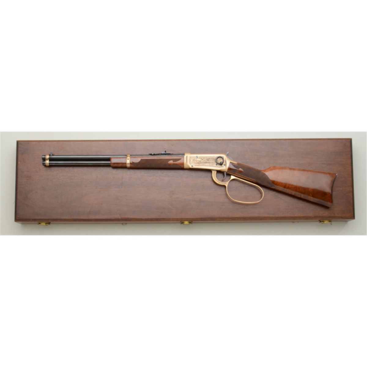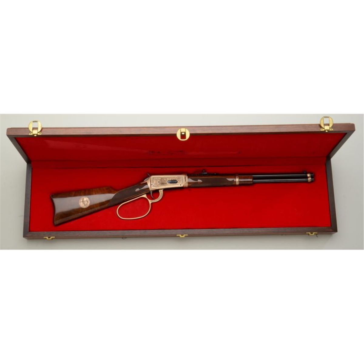 Important John Wayne “Duke-One of One Thousand” Commemorative Winchester Model 94 lever action carbine, .32-40 Win. cal., 18-1/2” barrel, blue finish to barrel assembly, ornamented receiver with classicWestern panel scenes and names of Wayne’s many Western Movies; deluxe wood checkered stocks with inset John Wayne coin in right butt stock, #Duke 232; accompanied by a deluxe lined wood display case and importantpaperwork authenticating this Winchester was gifted from the Duke’s son, Michael Wayne to the late George “Chick” Iverson, well-known Newport Beach, California businessman. The gun is in overall excellent condition showing little use or handling; case is in overall fine condition with some scratches and mars from storage. A documented Wayne family gun. Est.: $2,000-$4,000.