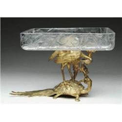 VICTORIAN CENTERPIECE. Very unique centerpiece has square glass bowl of clear crystal impressed with bamboo leaf design with a bird resting on bamboo