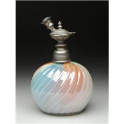 VICTORIAN RAINBOW ATOMIZER. Victorian atomizer features swirled rainbow colors of blue, peach and yellow cased beneath a clear glass swirl rib outer