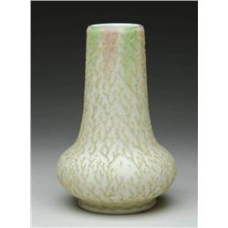 RAINBOW SATIN GLASS VASE. Pink and green on a creamy white background having applied coralene decoration. SIZE: 9-1/4" t. CONDITION: Minor...