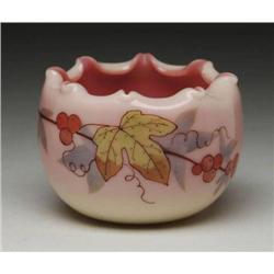 WEBB BURMESE ROSE BOWL. Rare decorated glossy Burmese rose bowl has berry and leaf design. Signed on the underside "Queens Burmesware Patente...