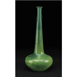 DESIRE CHRISTIAN VASE. Fine cameo vase has dark green wheel-carved water lilies against a light green background. The long slender neck of the vase