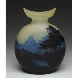 GALLE FRENCH CAMEO VASE. Super scenic vase with blue mountains and lake. Excellent color. Pilgrim shape. Acid-etched "Galle" on side o...