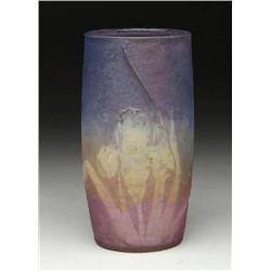 DAUM FRENCH CAMEO TUMBLER. Sophisticated wheel-carved workmanship on the iris and leaf decoration. Colorless on frosted to yellow to pink background