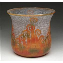 LE VERRE MONUMENTAL JARDINIERE. Representing the epitome of Art Nouveau, this monumental Le Verre jardinière is decorated with an orange and g...