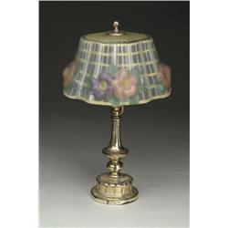 PAIRPOINT PUFFY BOUDOIR LAMP. Rose colored roses and purple pansy-type flowers on yellow and frosted lattice background on Stratford shade. Signed...
