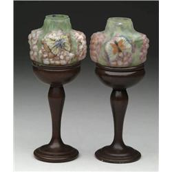 PAIR OF PAIRPOINT PUFFY CANDLE LAMPS. Pretty pink lilac and butterfly puffy decoration. SIZE: Overall height is 10". CONDITION: One shade ...
