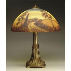 JEFFERSON TABLE LAMP. Colorful reverse painted woodland scene with pretty blue sky. Signed "2680 Jefferson Co. FH". Rare bulbous glass ...