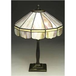 DUFFNER AND KIMBERLY LAMP. Very pretty unsigned Duffner & Kimberly table lamp has simple geometric shade of striated lavender and green glass. ...