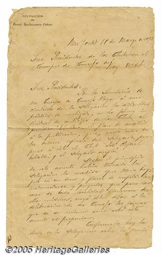 <B>Important Manifesto-like ALS by 19th Century Cuban Revolutionary Jose Marti</B></I> This four page legal size letter, written in 1893 to the Presidents of Cuban exiled clubs in Florida seeking financial support for <I>El Tara,</B></I> a revolutionary newspaper printed in Key West for distribution in Cuba. Marti calls the paper, "the voice of the revolution in the island (Cuba)," and declares support for its publication "urgent." "Day by day it delivers the voice of harmony and in Cuba the voice of the revolution. Do not be afraid to honor those to whom honor is deserved." Lots of powerful rhetoric from a man who is considered one of the greatest writers of the Hispanic world. Born in Havana in 1853, he was by the age of seventeen a committed revolutionary, exiled to Spain for his political activities. He lived in Cuba, Spain, Mexico, Guatemala, and Venezuela, all which he fled out of opposition to dictatorial governments there. He was a visionary "aging". There is minor edge roughness, and a couple of partial separations along weakened fold lines which detract minimally. A great opportunity for the serious student of Latin American history to gain insight into this prominent revolutionary. Note: A full appropriate English translation of the text is available upon request. <I>PSA/DNA lacks sufficient comparable examples to render an opinion on this item. While we believe it to be authentic as described, it is thus sold without certification.</B></I>