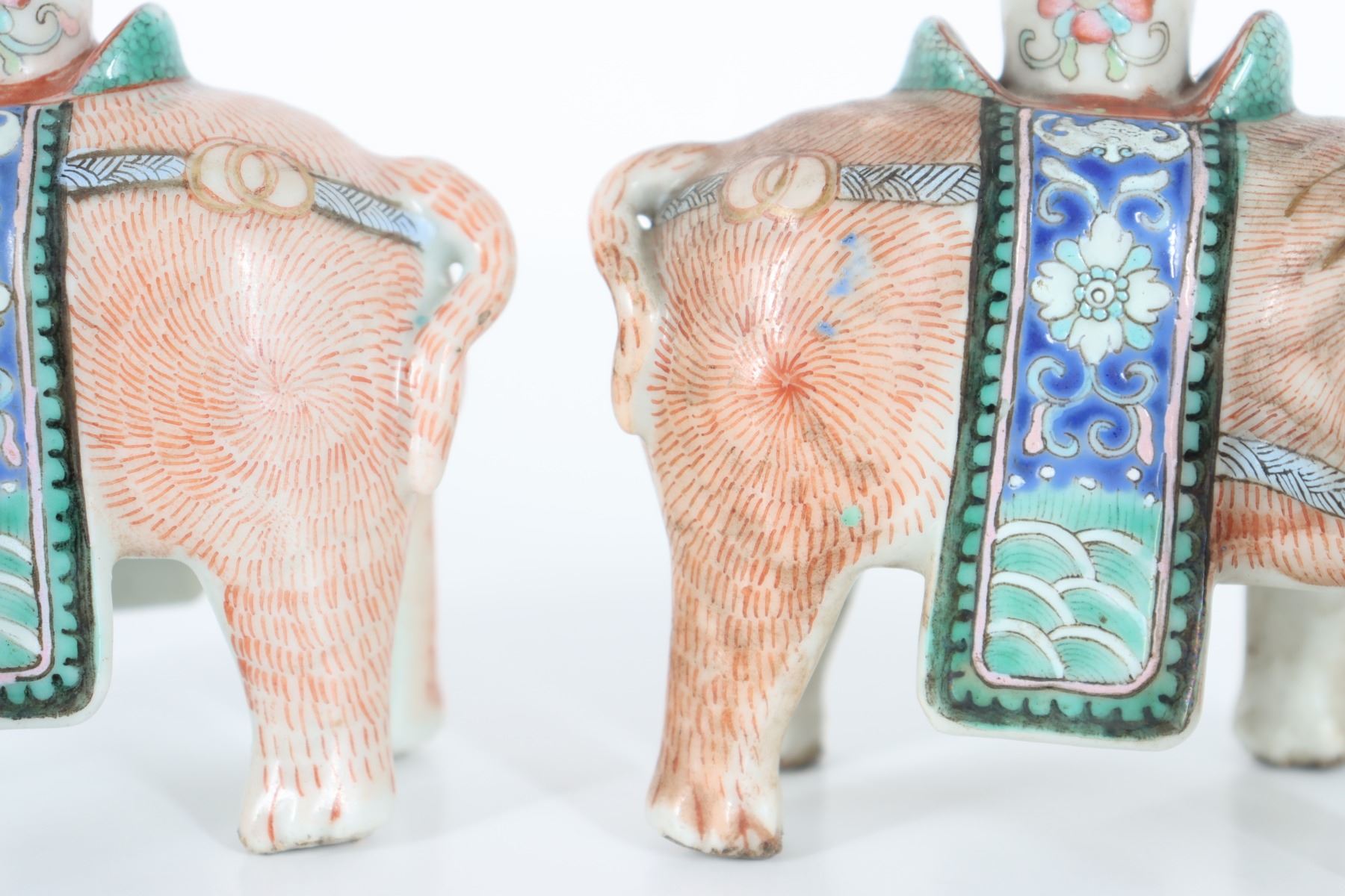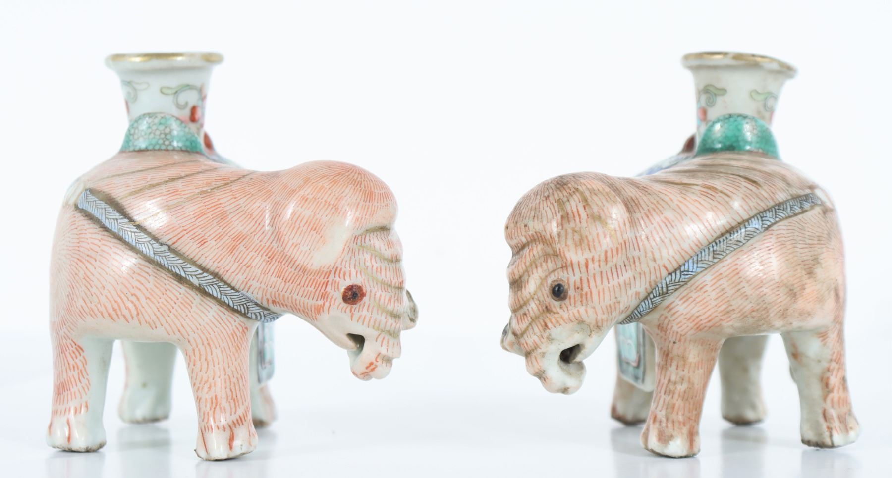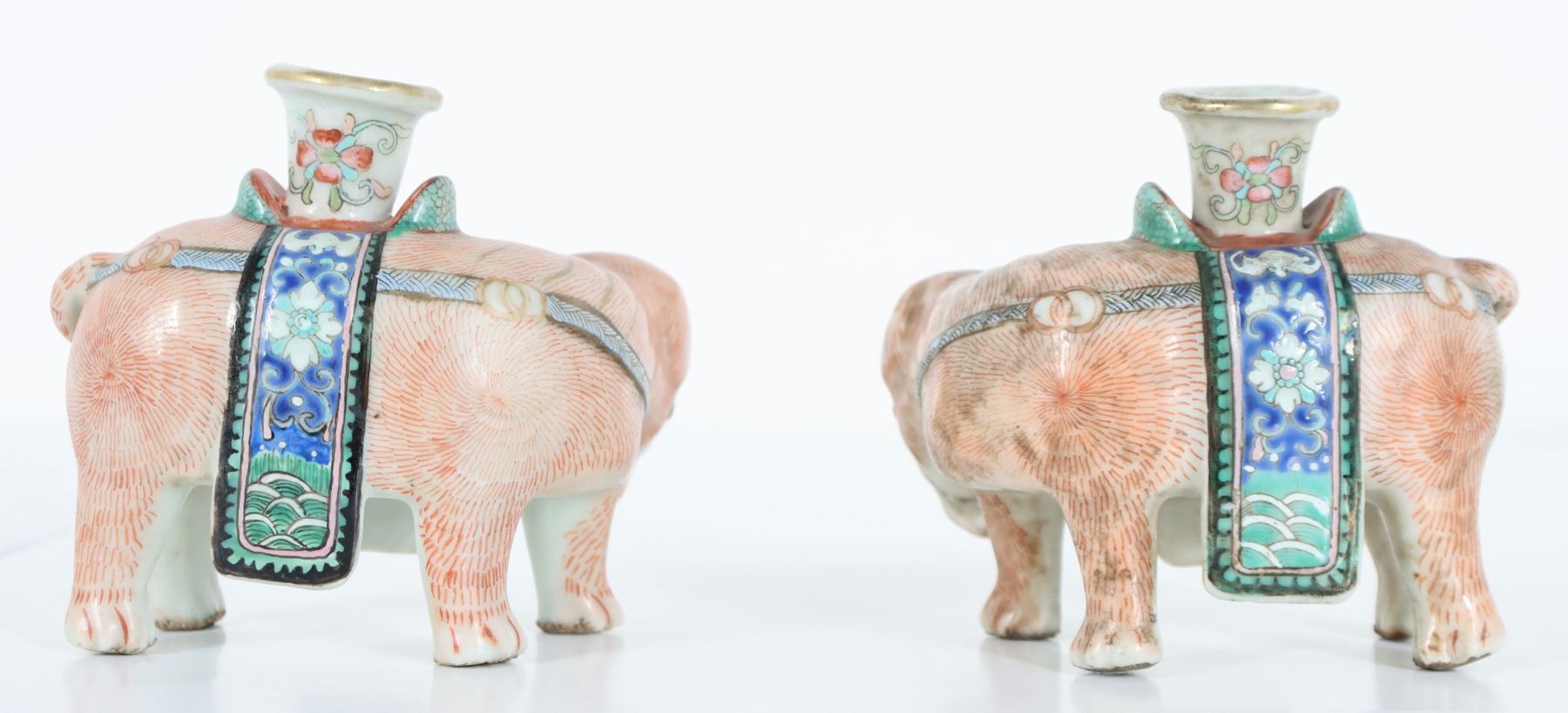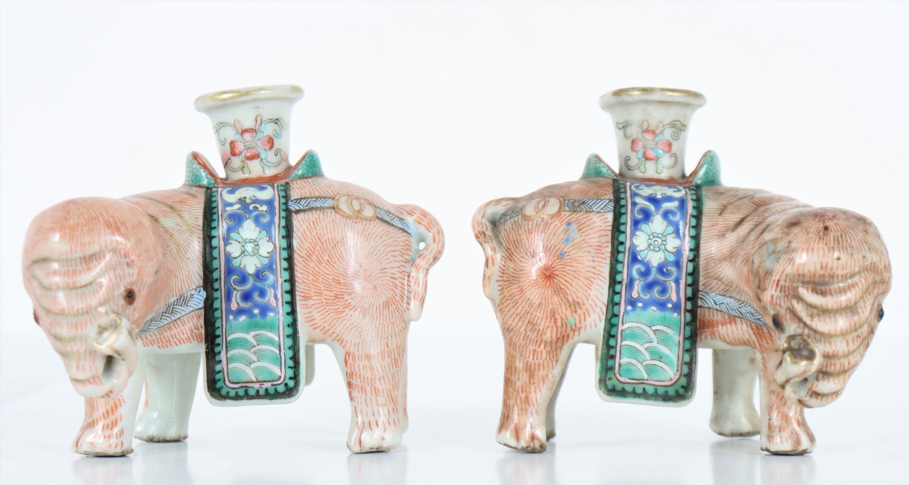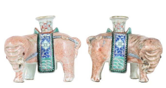 Rare pair of porcelain famille decorated elephant candlesticks. From the Chinese export trade.