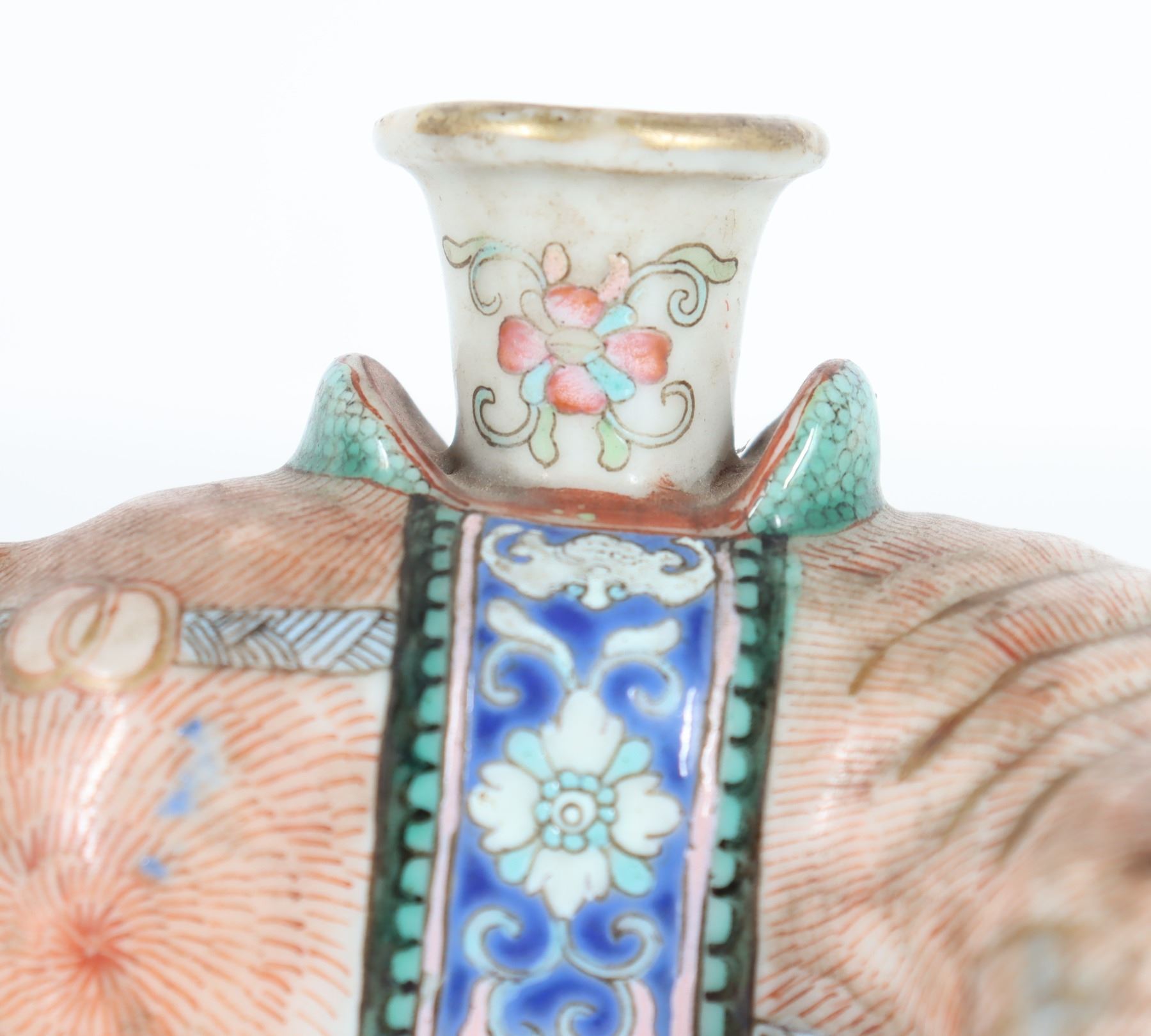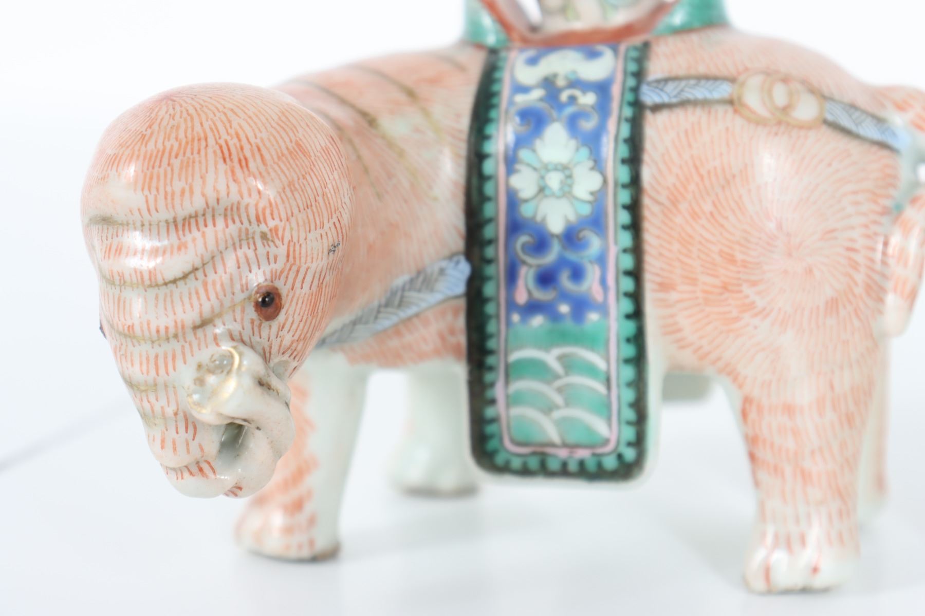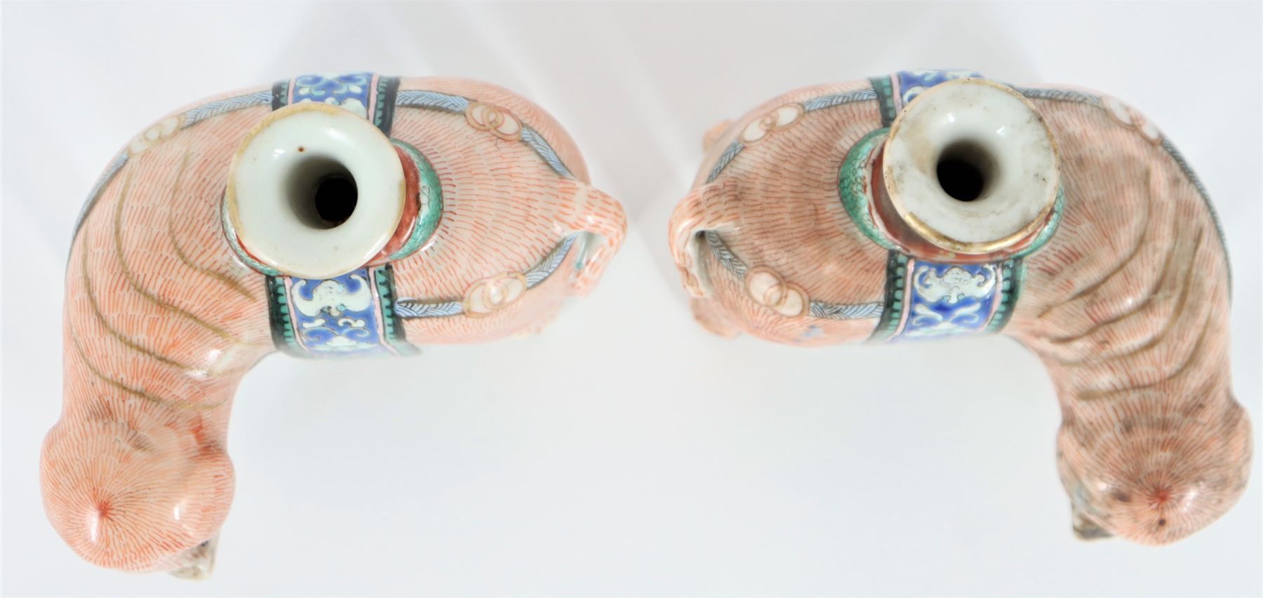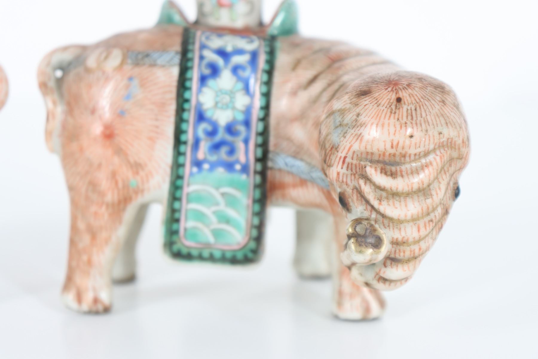 Rare pair of porcelain famille decorated elephant candlesticks. From the Chinese export trade.