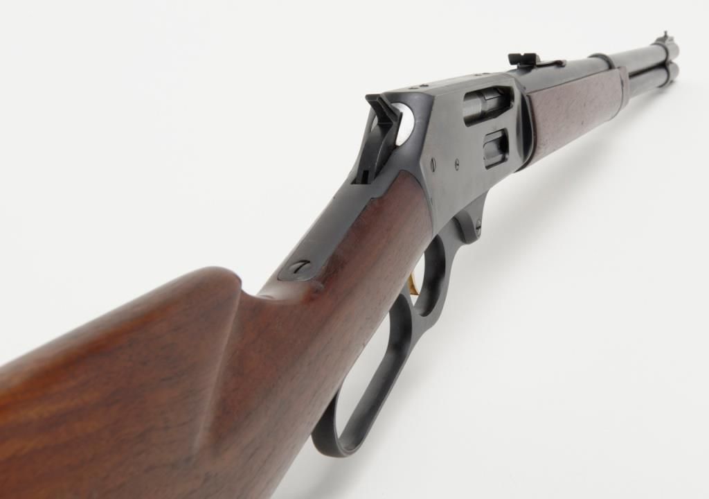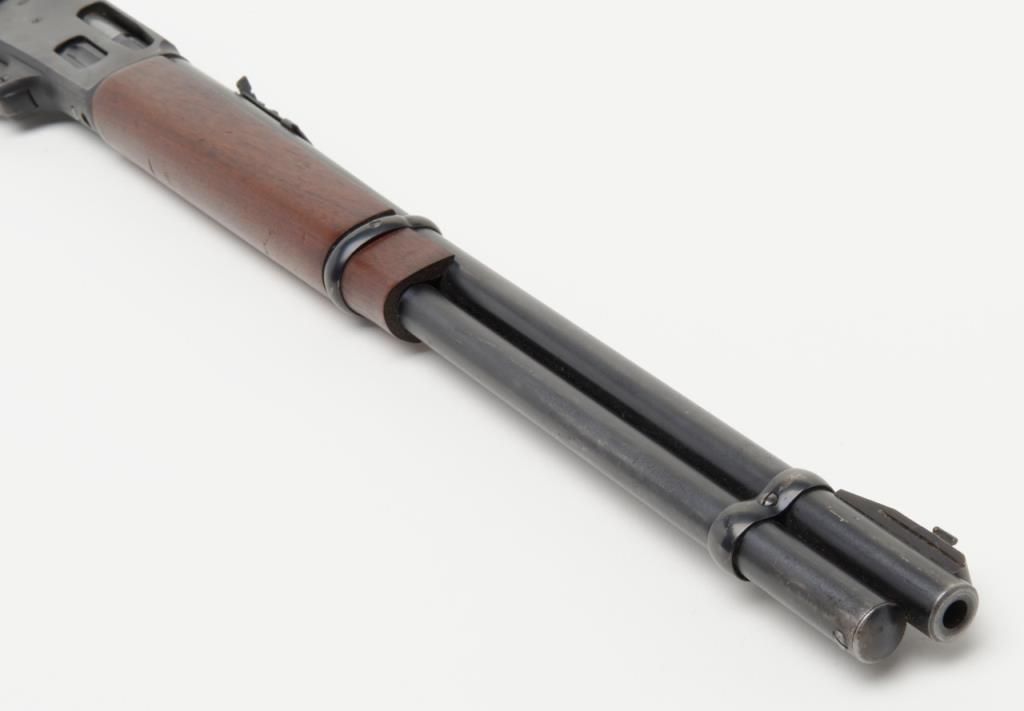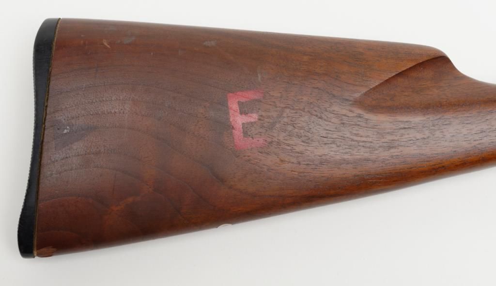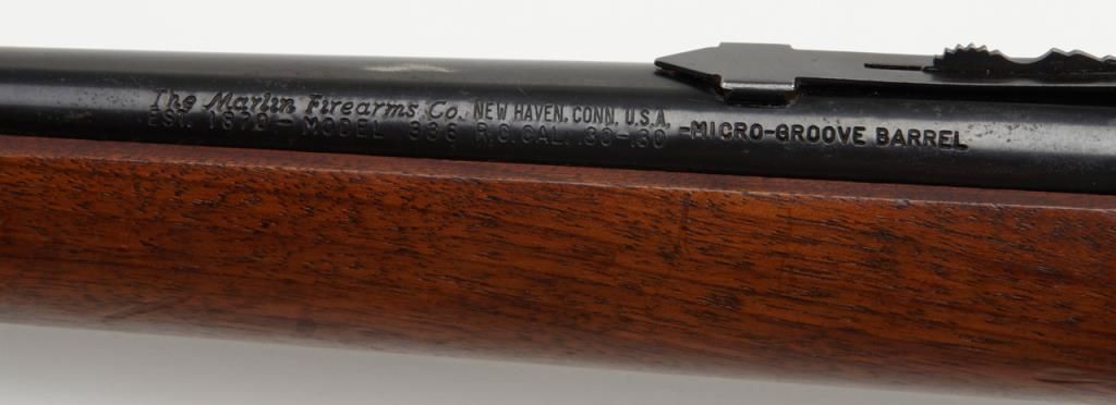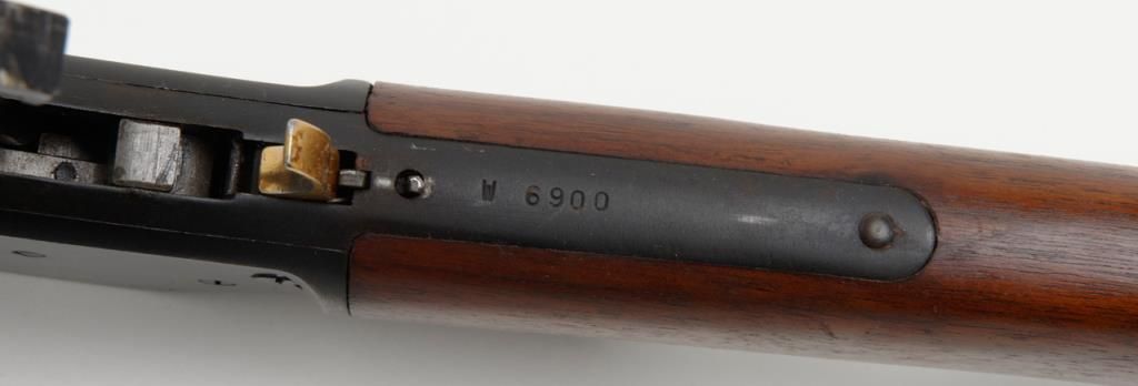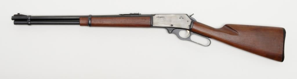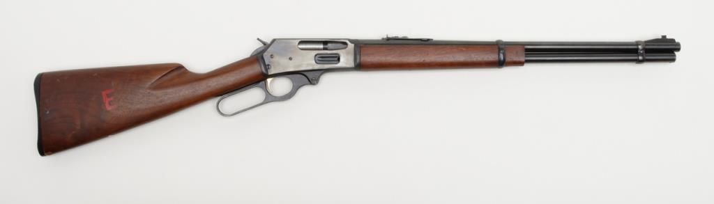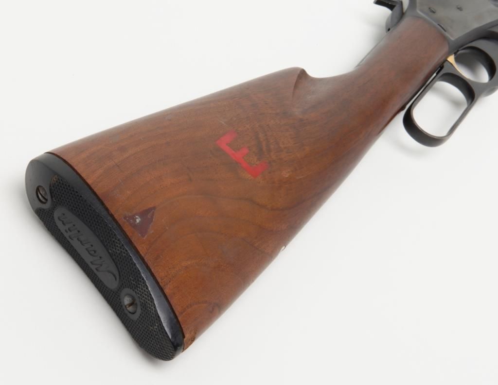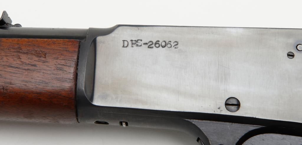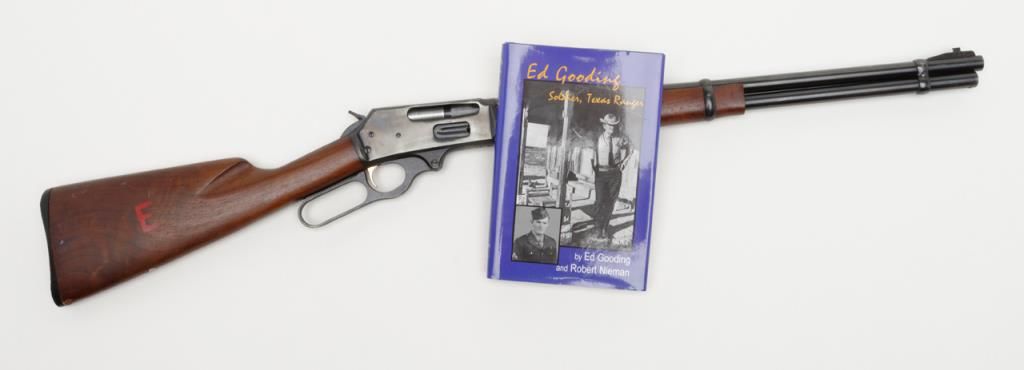 Important Texas Ranger Marlin Model 336 R.C. lever action carbine, .30-30 cal., 20” barrel, blue finish, wood stocks with red “E” painted on right side of butt stock and “DPS-26062” stamped on the left side of the receiver, #6900 in overall finecondition showing the majority of its original finish, fine bore, crisp action and markings, very good to fine stocks with some scattered nicks and mars from carry and storage. This gun is accompanied by a folder of information includingan original document on Texas Ranger letterhead dated March 19, 1974, referencing this gun by serial number and certifying it was carried by Ed Gooding while serving in the Texas Rangers. The letter is notarized and signed by then SeniorRanger Captain Clint Peoples. This letter is addressed to the late Mr. Charles Schreiner, III, of YO Ranch fame and from his collection the gun originated (Little John’s sold Charlie’s collection of Texas Ranger guns in April, 2003);also included is the original DPS property inventory card for the gun and a 3” x 5” card Charlie kept in his collection for the gun indicating “Gooding was stationed in Kerrville for many years” (near the YO Ranch) and further