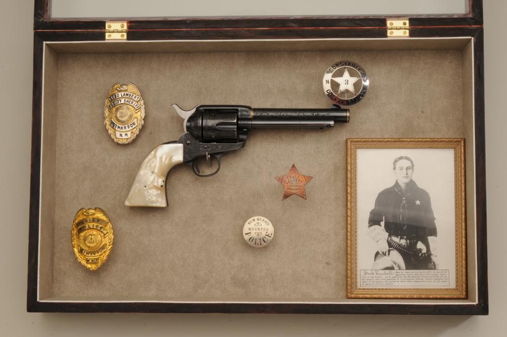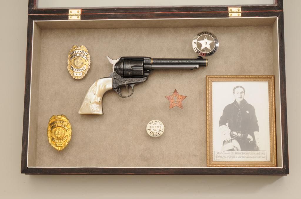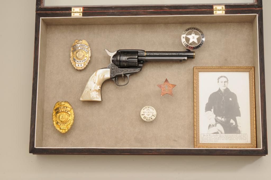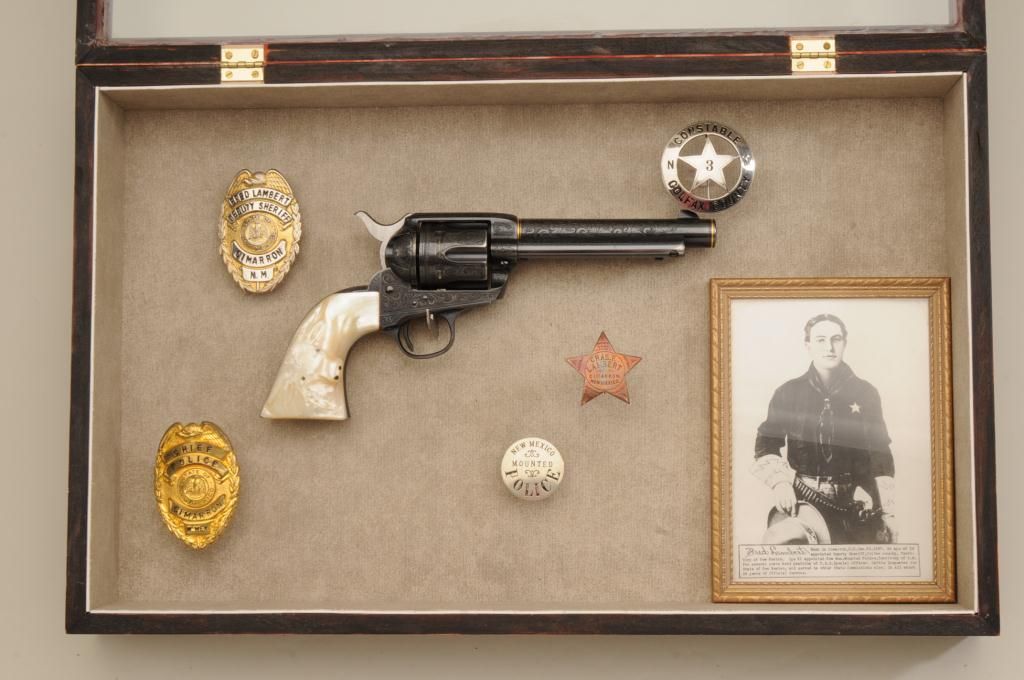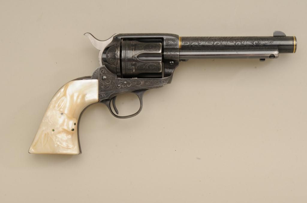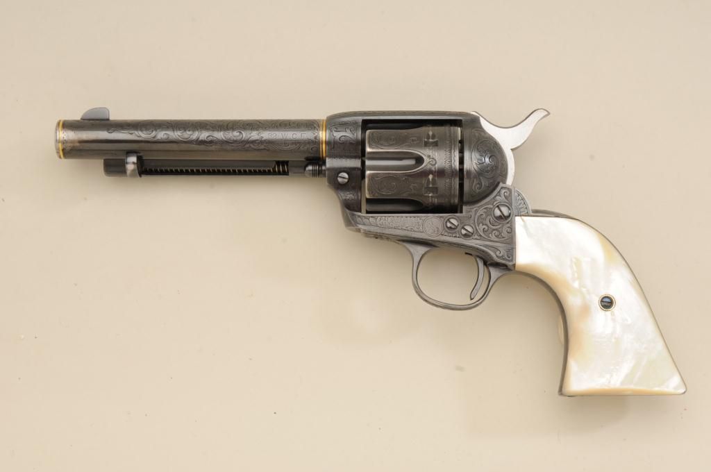 Important factory engraved, gold banded and inscribed on backstrap “CIMARRON, NEW MEXICO”, SAA revolver belonging to New Mexico lawman Fred Lambert; .32 W.C.F. cal., 5-1/2” barrel, re-blued finish, raised carved steer head pearl grips, #305332 with factory letter confirming caliber, barrel length, blue finish, factory engraved, inscribed and embellished with two gold bands, shipped to Chas. F. Lambert, address “Unavailable”,shipped January 15, 1908, one gun in shipment; also accompanied by a wood and glass display case, 5 badges, a large 3-ring binder of photos and documents related to Lambert’s lengthy career; also a record bythe Western Heritage Press of the Last Rites of Fred Lambert (1887-1971) held at the Cimarron Community Methodist Church on February 9, 1971. This gun is in overall beautiful condition as factory refinishedyears ago (note in accompanying binder suggests re-blue done by factory in the fall of 1912) showing the majority of that blue, matching visible serial numbers, fine deluxe Helfricht engraved in the style of the Sears